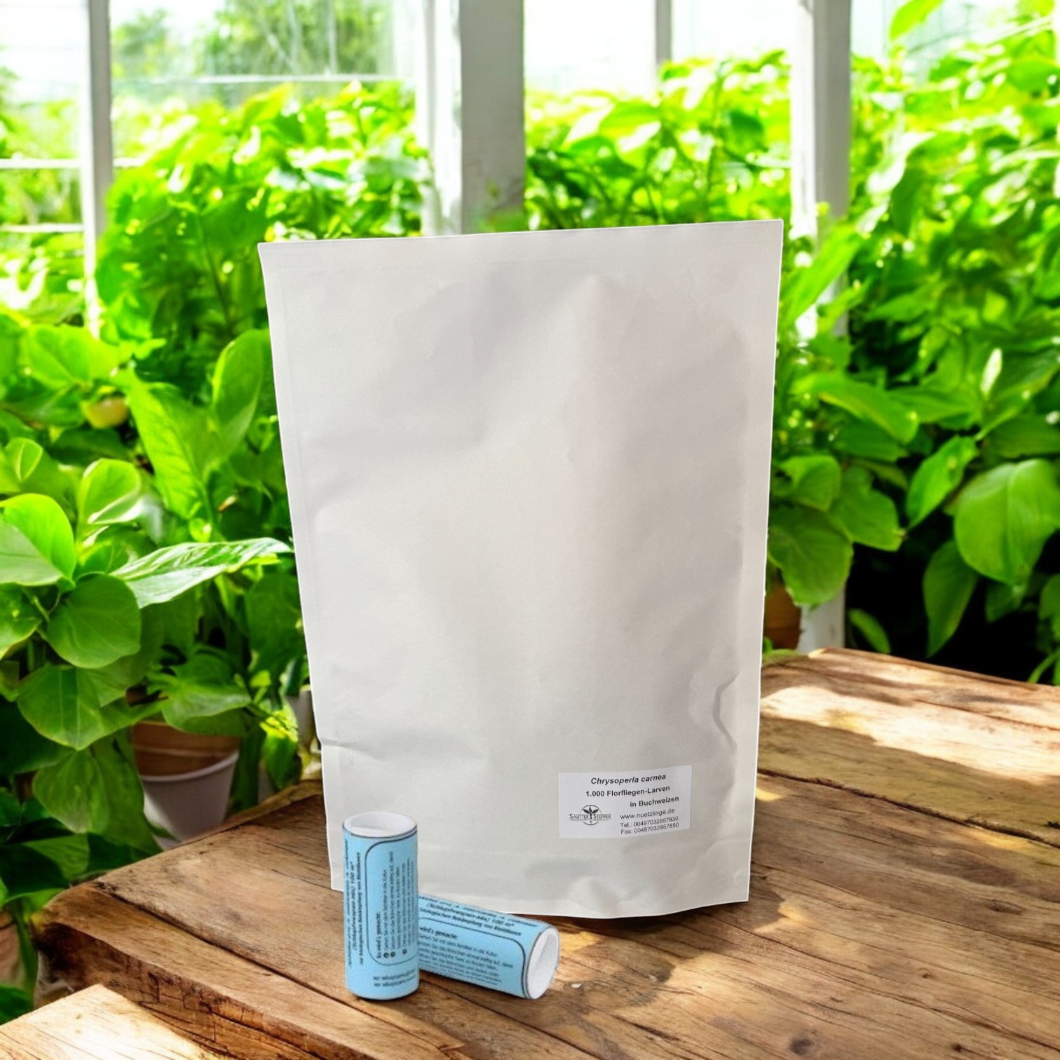 Es besteht aus 1.000 Florfliegenlarven in Buchweizenspelzen und zwei Schlupfwespenmixe.